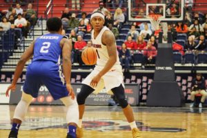 Photo by Edward Major / Staff Photographer | Duquesne guard Mike Lewis II handles the ball during the Dukes’ home contest versus St. Francis (BKN) on Nov. 11, 2017.
