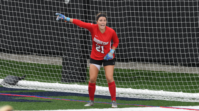 Duquesne’s Karley Steinher was there to interfere and head the pass attempt. Instead of the header going out of bounds, it went high in the air and behind Duquesne goalkeeper Megan Virgin into the net, helping Massachusetts secure the victory.