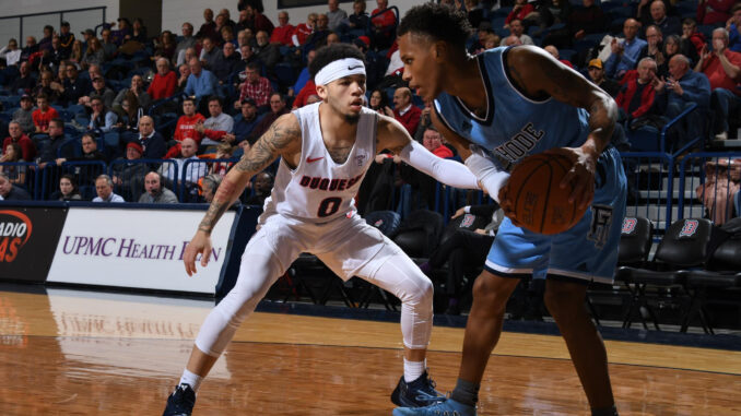 Courtesy of Duquesne Athletics | Duquesne guard Tavian Dunn-Martin guards Rhode Island’s Fatts Russell during a 2019 game.