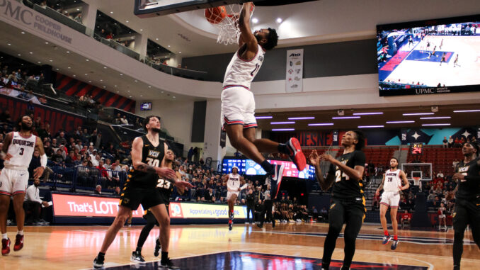Peter Boettger | Layout/Multimedia Editor | Rodney Gunn Jr. — pictured here on Jan. 4 — scored 26 points in Wednesday’s win, the highest mark of his Duquesne career.