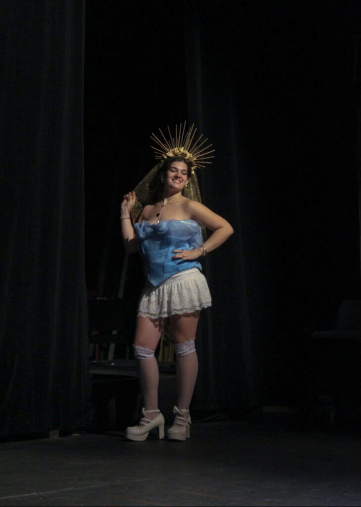 Ava Rieger | Staff Photographer | Taylor Hufnagel designed three outfits, including her own, for the upcycled fashion show. For each one of her outfits she used old costumes she already had.