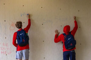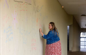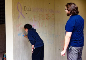 Photos by Brentaro Yamane| Multimedia EditorAlicia Simpson, the Title IX Coordinator and Director of Sexual Misconduct Prevention & Response at Duquesne, took some time to write a message as well after seeing other students write on the wall earlier in the day. She has served in this position for over two years.Different colored pieces of chalk were given out to students who wanted to write thoughtful and caring messages to people who have dealt with domestic violence and who wanted to provide awareness.Duquesne men’s soccer players Jack Jennings (left) and Chris Philibin (right) stopped by the union to join other Duquesne students in writing positive messages on the wall to help spread awareness and prevent domestic violence.Ryan Sabolcik watches student Alice Kuncil write a message on the wall. Kuncil was playing frisbee with a class outside the front lawn of College Hall when the chalk caught her eye.