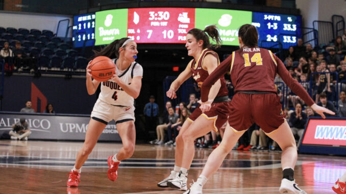 The fourth quarter was also back and forth, but Duquesne started out hot. Johnson and Hamilton combined to score the Dukes’ first 12 points in the quarter. Then, a Duquesne 10-0 run that began at the 5:23 mark helped the Dukes pull away and put the game out of reach.