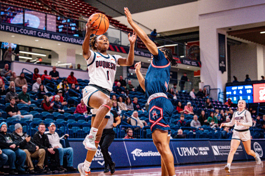 There was very little separating the Dukes and Spiders in the first quarter. Up until the media timeout, it was the defense that allowed Richmond to eke ahead while scores remained few and far between. As the quarter rolled on, Grace Townsend’s and Katie Hill’s efforts slowly tallied up points for the Spiders. However, Jerni Kiaku went five-for-five in free throws and had a pair of fast-break points to give Duquesne a 15-13 lead at the end of the first quarter.